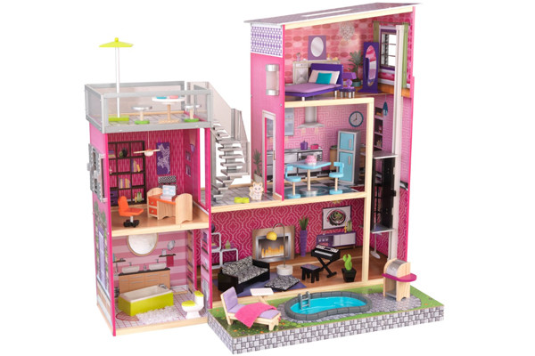 Vorstelijke villa van Kidkraft. Gedetailleerd poppenhuis met maar liefst 4 verdiepingen, een garage met openstaande deuren en een lift. Inclusief 34 losse meubelstukken (zoals afgebeeld). De afmeting van dit poppenhuis is 130x36x134 cm. Speel met je poppen (max. 30 cm) in deze vorstelijke villa met maar liefst 8 vertrekken.